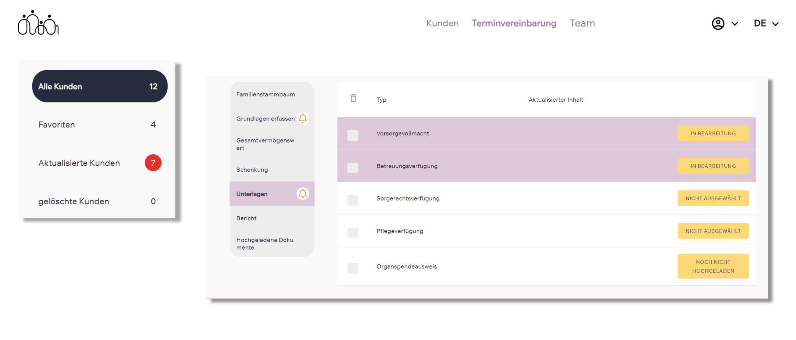 Über ein separates Tool erhalten Ihre Generationenberater/-innen jederzeit einen Überblick über ihre Kunden und die zur Verfügung gestellten Eingaben. So können sie sich optimal auf das gemeinsame Gespräch vorbereiten und die passenden Unterstützungsleistungen anbieten.