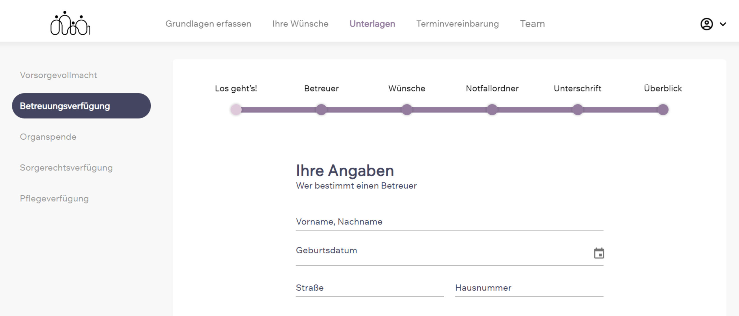 Mit FutureCare stehen Ihren Kunden eine Reihe wichtiger Dokumente zur Verfügung. Ihre Kunden wählen, ob sie diese Schritt für Schritt digital oder gemeinsam mit einem Berater oder einer Beraterin ausfüllen möchten. Eine Uploadfunktion ermöglicht, die fertigen Dokumente im eigenen FutureCare Profil sicher zu speichern.
