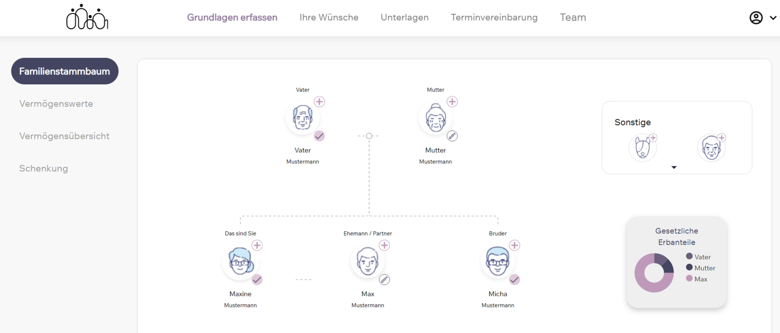 Im Stammbaum haben Ihre Kunden die Möglichkeit, ihre Familienverhältnisse übersichtlich darzustellen. Mit spielerischen Elementen können Bilder hinzugefügt und die Art der Beziehung zwischen den Familienmitgliedern visualisiert werden.