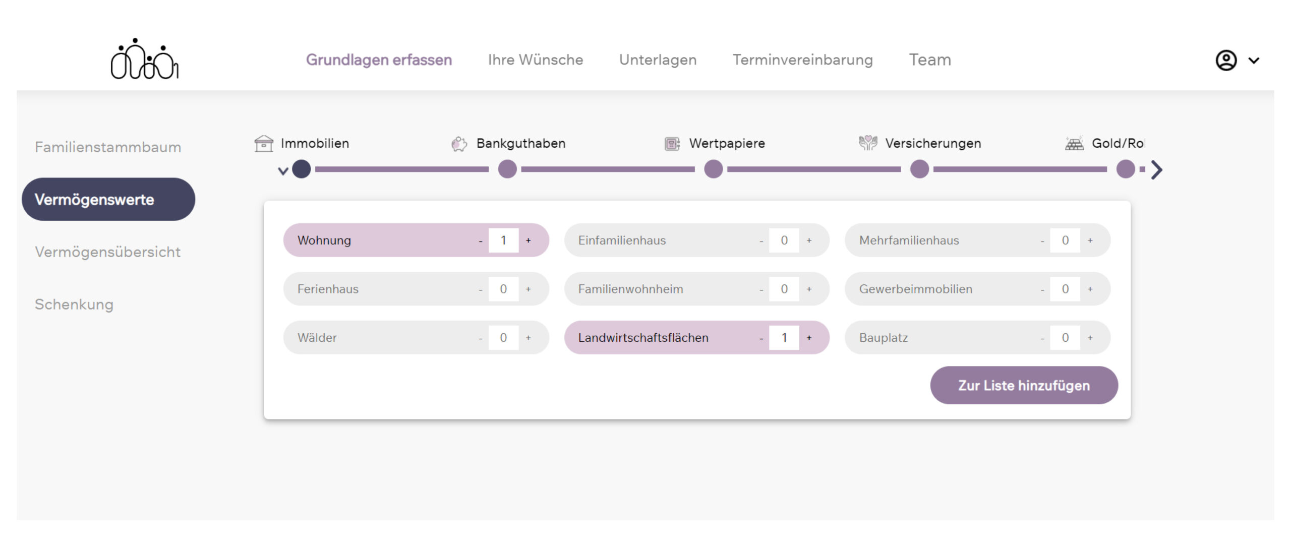 Im weiteren Verlauf können die Vermögensverhältnisse strukturiert und übersichtlich erfasst werden. Zudem steht ein Dateiupload zur Verfügung. Die für den Kunden oft sensiblen Daten werden auf sicheren, deutschen Serversystemen gespeichert. Ein reibungsloser und unkomplizierter Datenaustausch zwischen Ihnen und Ihren Kunden ist somit sichergestellt.